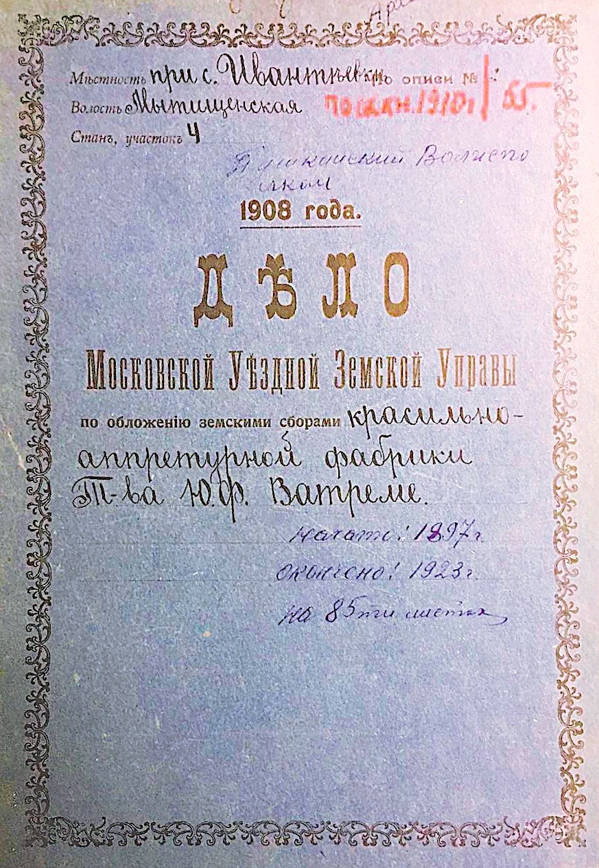 ЦГАМО, ф. 2069, оп. 1, д. 20: Сведения, поданные в Московское губернское земство по красильной и аппретурной фабрике Ю. Ф. Ватреме в 1897 году.
