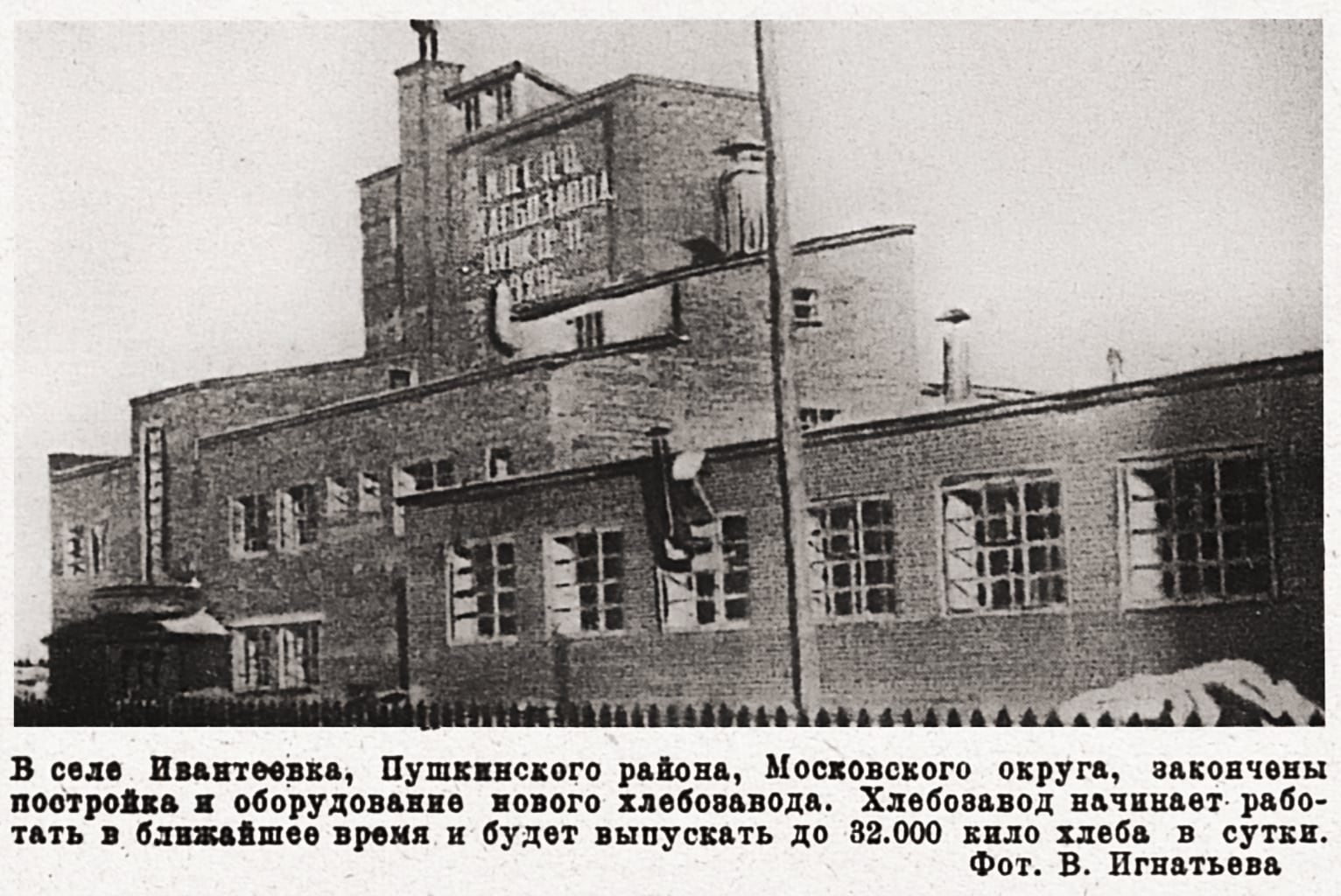 Подпись к первой фотографии гласит: «В селе Ивантеевка, Пушкинского района, Московского округа, закончены постройка и оборудование нового хлебозавода, он будет выпускать 32.000 кило хлеба в сутки». Напомним, что стройка началась в 1926-27 гг. Московским областным союзом потребительских обществ (МОСПО), а открылся хлебозавод 1 октября 1929 г.