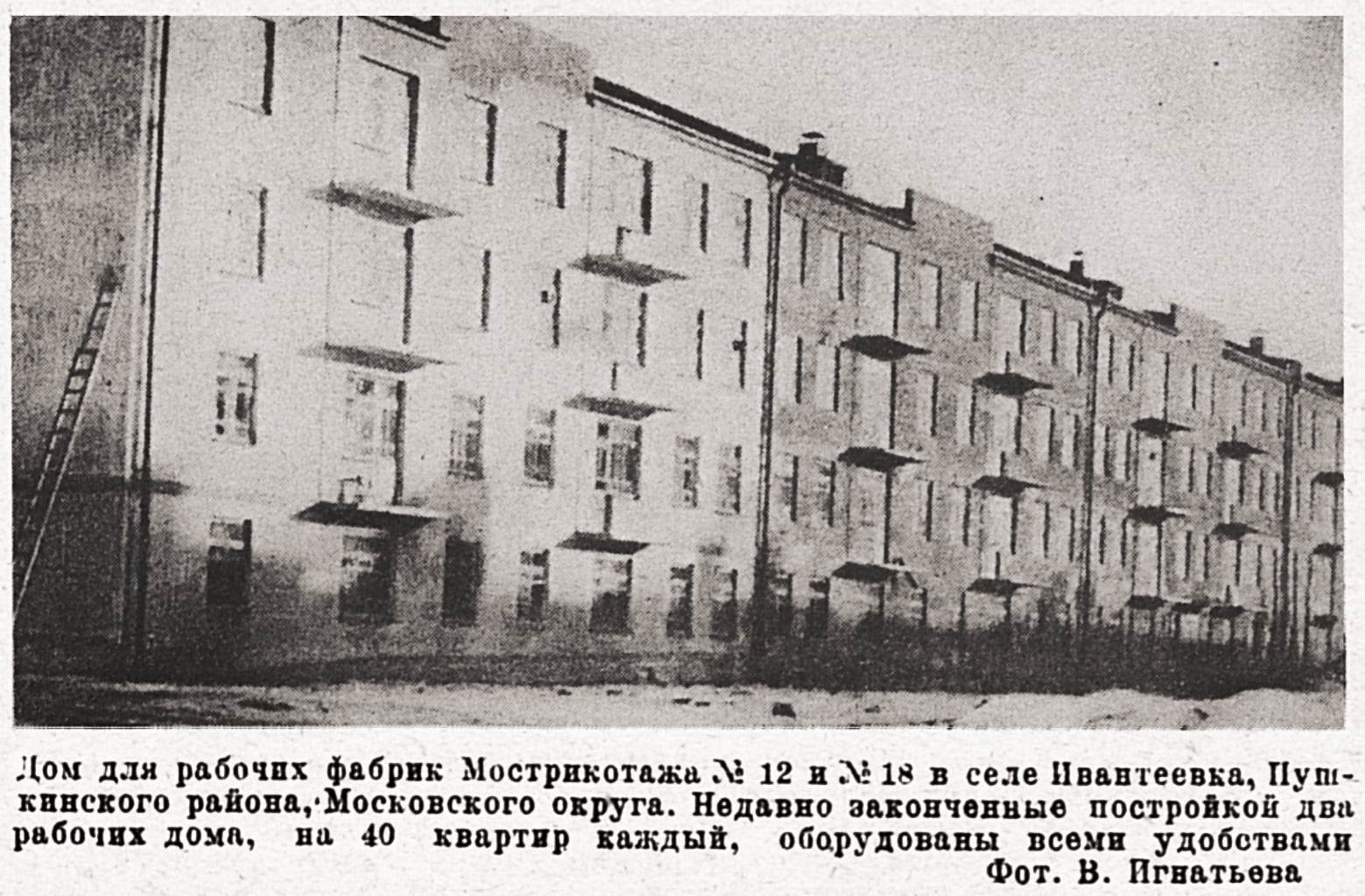 Из подписи ко второму фото: «Дом для рабочих фабрик Мострикотаж № 12 и № 13 в селе Ивантеевка. Недавно законченные постройки двух рабочих домов, на 40 квартир каждый, оборудованы всеми удобствами». Сейчас это дома № 8 и № 10 на Трудовой улице в микрорайоне ФУБРы (от ФУБР — Фонд улучшения быта рабочих).