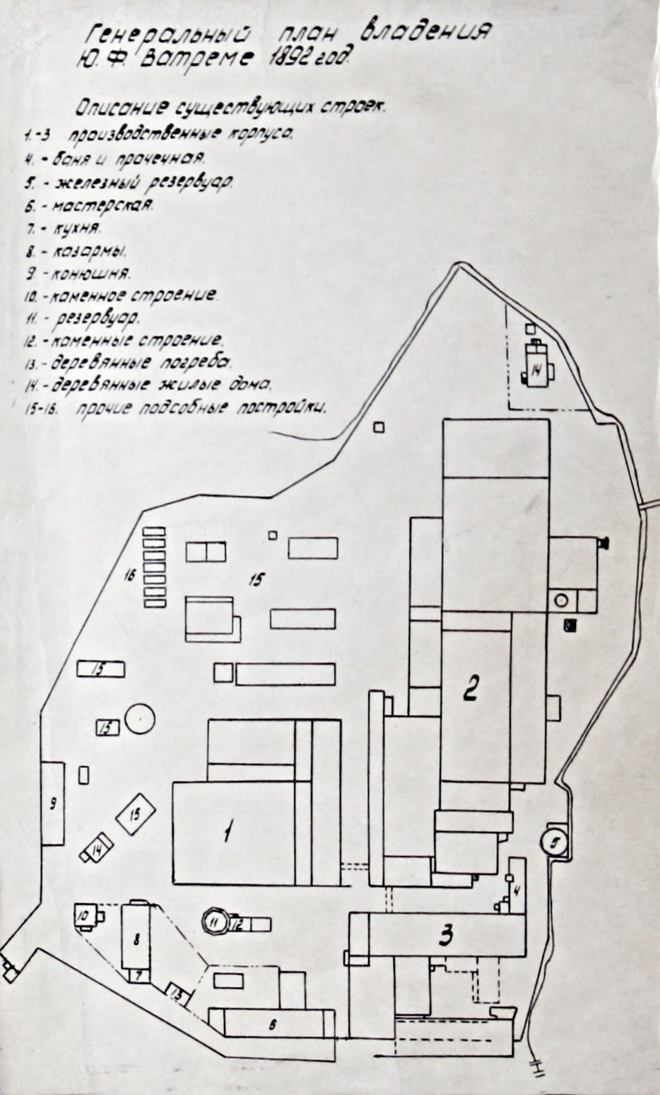 В 1880 году на территории фабрики располагалось 21 фабричное строение, из них 17 производственных. Четыре жилых помещения: две двухэтажные спальни для рабочих; квартира для 11 старших надсмотрщиков; жильё для мастеров, совмещённое с одноэтажным помещением больницы.
