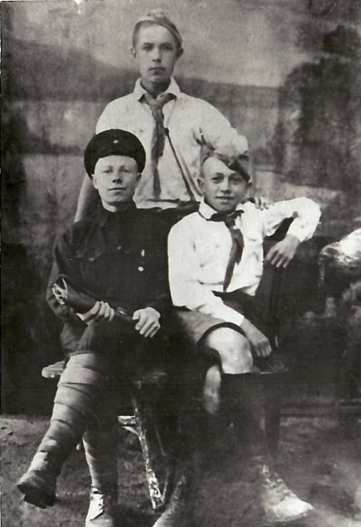 1920 г., сидят Сергей Костерин (в тёмном) и Василий Федосов, стоит Саша Белов. (Ивантеевский историко-краеведческий музей)
