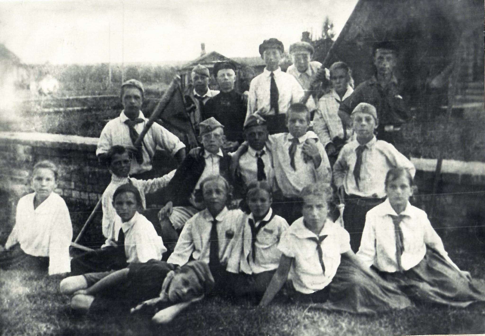 Февраль 1924 г., Совет вожатых. Сидят слева направо: Саша Баскаков, Нюра Драгунова, Алёша Калышев, в середине Вася Сурков. Стоят: Николай Ткачёв, Витя Панкратов и Вася Федосов. (Ивантеевский историко-краеведческий музей)