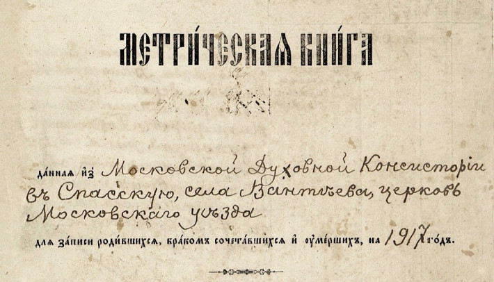 Справка по фондам: Центральный государственный архив Москвы (ЦГА Москвы). Фонд 203: Московская духовная дикастерия, г. Москва. (1723-1744). Опись 780: Метрические книги церквей Московской губернии, с 1870 до 1919. Дело: село Вантеево/Вантеевка, Ивантеевка/ церковь Спасская, № 4843 и № 4844, с 1914 по 1915 год включительно и с 1916 по 1917 годы соответственно.