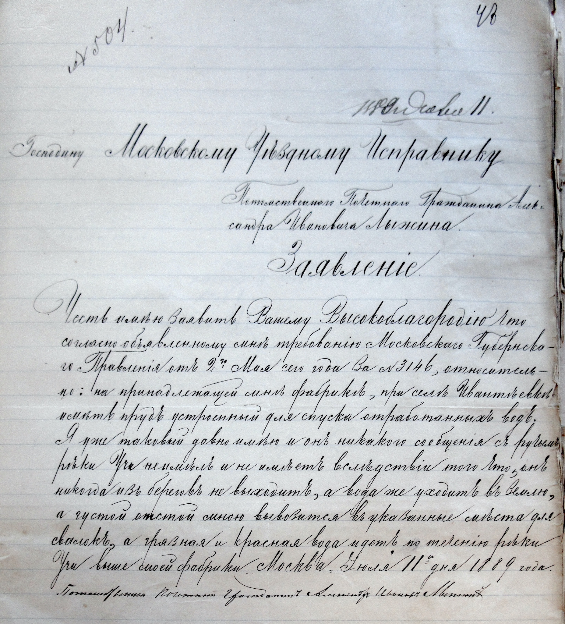 «… я уже таковой давно имею, и он никакого сообщения с ручьём реки Учи не имел и не имеет вследствие того, что он никогда из берегов не выходит, а вода же уходит в землю, а густой отстой мною вывозится в указанные места для свалок, а грязная и красная вода идёт по течению реки Учи выше моей фабрики».