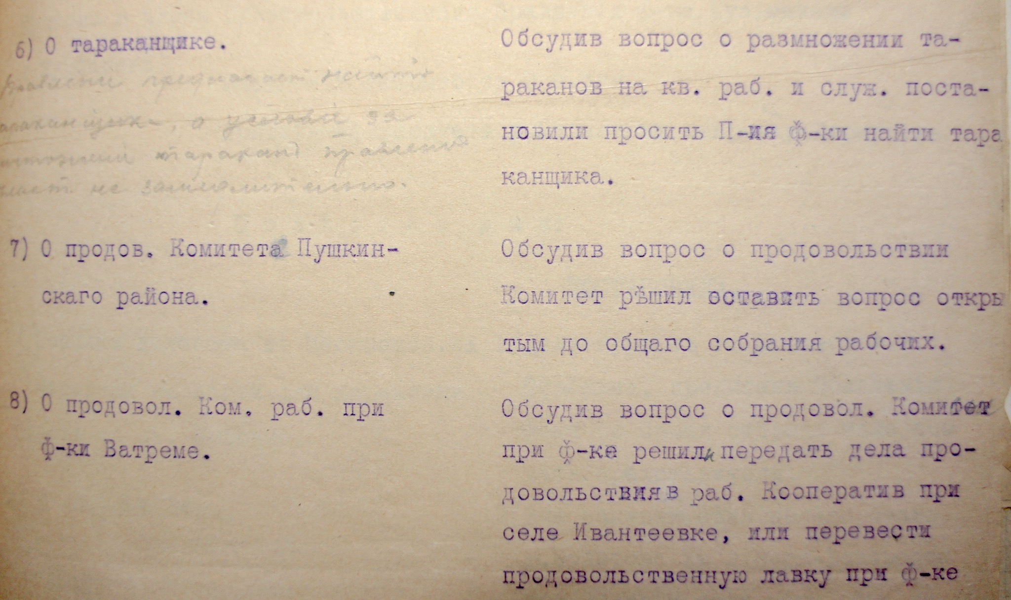 Обсудив вопрос о размножении тараканов на квартирах рабочих и служащих, на заседании постановили просить правление фабрики найти тараканщика, чтобы истребить столь вредных насекомых.