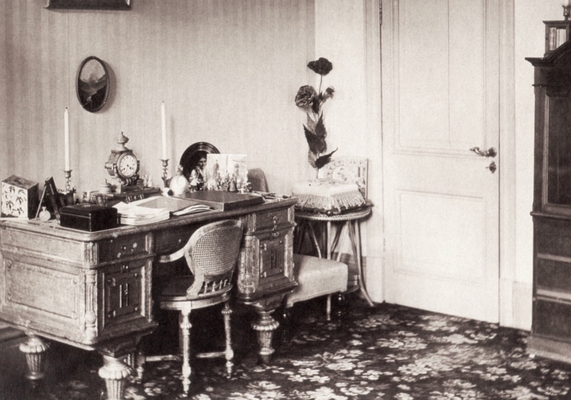 Две парусиновые занавески; мраморный стол для умывания; таз фаянсовый, кувшины для умывания (надтреснутые), ночной горшок, три мыльницы, тарелка и ведро фаянсовое. Шкаф с книгами, красного дерева большой зеркальный шкаф, письменный стол.