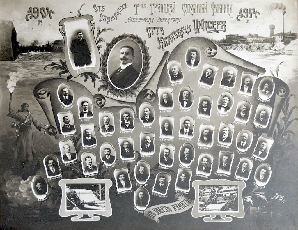 Что же происходило в промежуток с 1871 по 1876 год ещё предстоит выяснить. Известно, что у Карла Андреевича Ципсера был сын, директор «Товарищества Троицкой суконной фабрики» в 1904–1914 годах Отто Карлович Ципсер (1870–1919). Фото (в центре в овальной раме) прилагается.