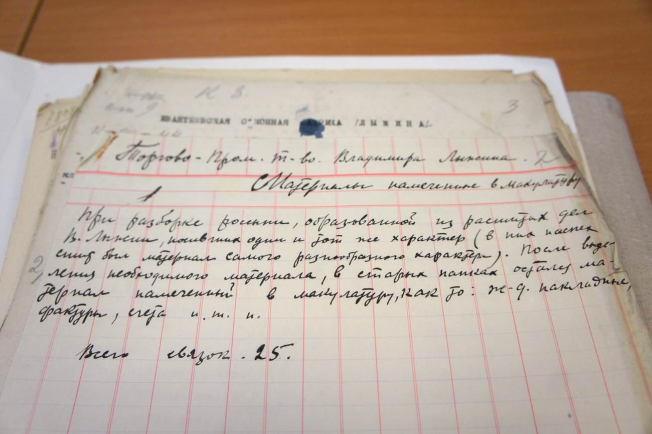 Дело содержит Главные книги, материальные, контрольные, срочные, и т. д., содержание которых составляют в основном расчёты и сметы. Есть уставы больницы, инвентарные журналы реконструкции фабрики, письма, к примеру, переписка с фабричным инспектором (1913–1915), с Московским военно-промышленным комитетом о перевозке грузов, с промышленными предприятиями об оборудовании электрической станции (1904–1918); об участи Владимира Лыжина в благотворительных обществах (1894–1918); ведомости выданных харчевых припасов жёнам лиц, ушедших на войну (1914), ведомости прихода денежных сумм церквей и списки певчих села Ивантеева (1903–1915).[1] В документах есть и путаница, это видно по описи фабрики, сделанной в 1918 году, многие письма и свидетельства которой, увы, не сохранились.