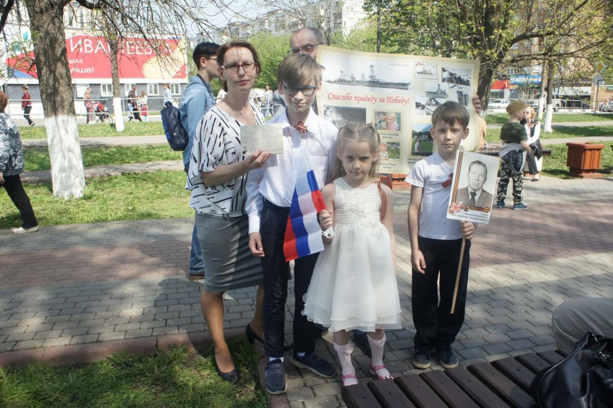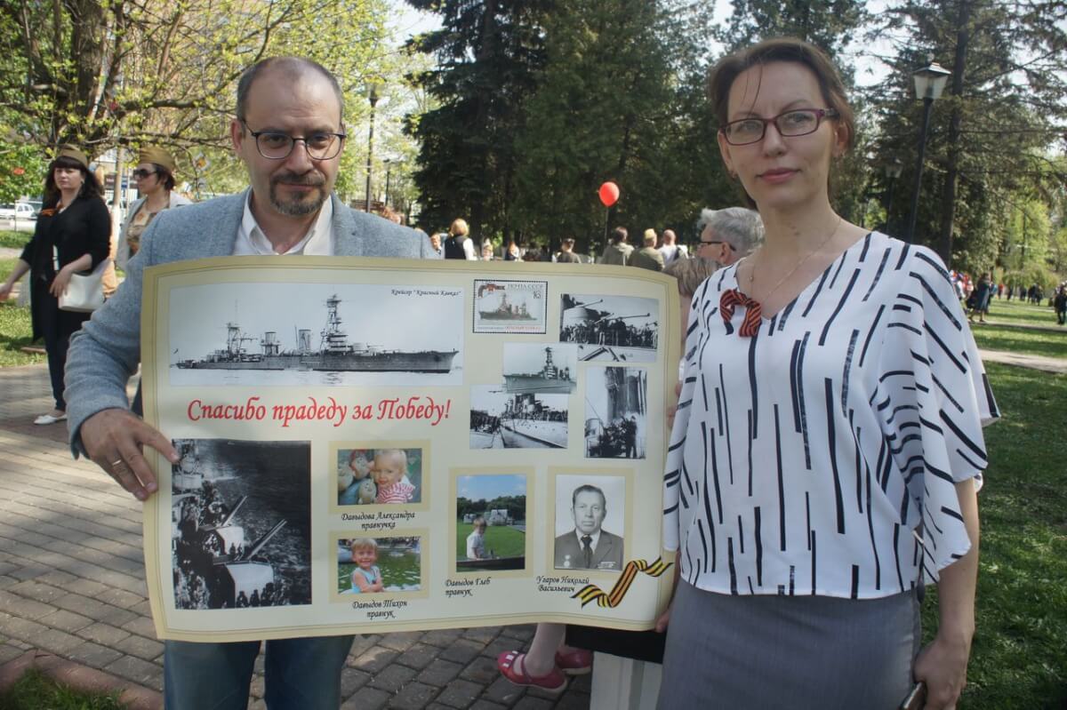 В День Победы нам удалось встретиться с ивантеевской семьёй Андрея Давыдова и Ланы Культовой, которые воспитывают троих замечательных детей, 13-летнего Глеба, 8-летнего Тихона и 5-летнюю Александру. У Андрея в руках был большой красочный плакат, описывающий часть боевого пути его деда — Николая Васильевича Угарова (1914–1980 гг.), который служил на легендарном гвардейском крейсере «Красный Кавказ», а также участвовал в войне с Японией уже в составе Тихоокеанского флота.