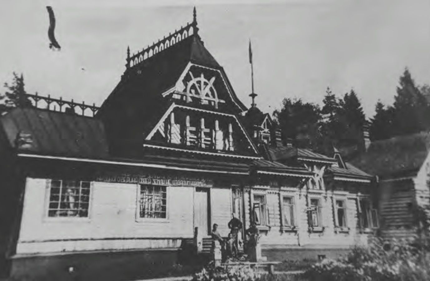 Позади магазина располагался дом трактирщика, купца Лёгонькова. Дом очень красивый, там было много резьбы по дереву. Затем на этом месте построили большой кирпичный детский сад («Радуга» — ред.).
