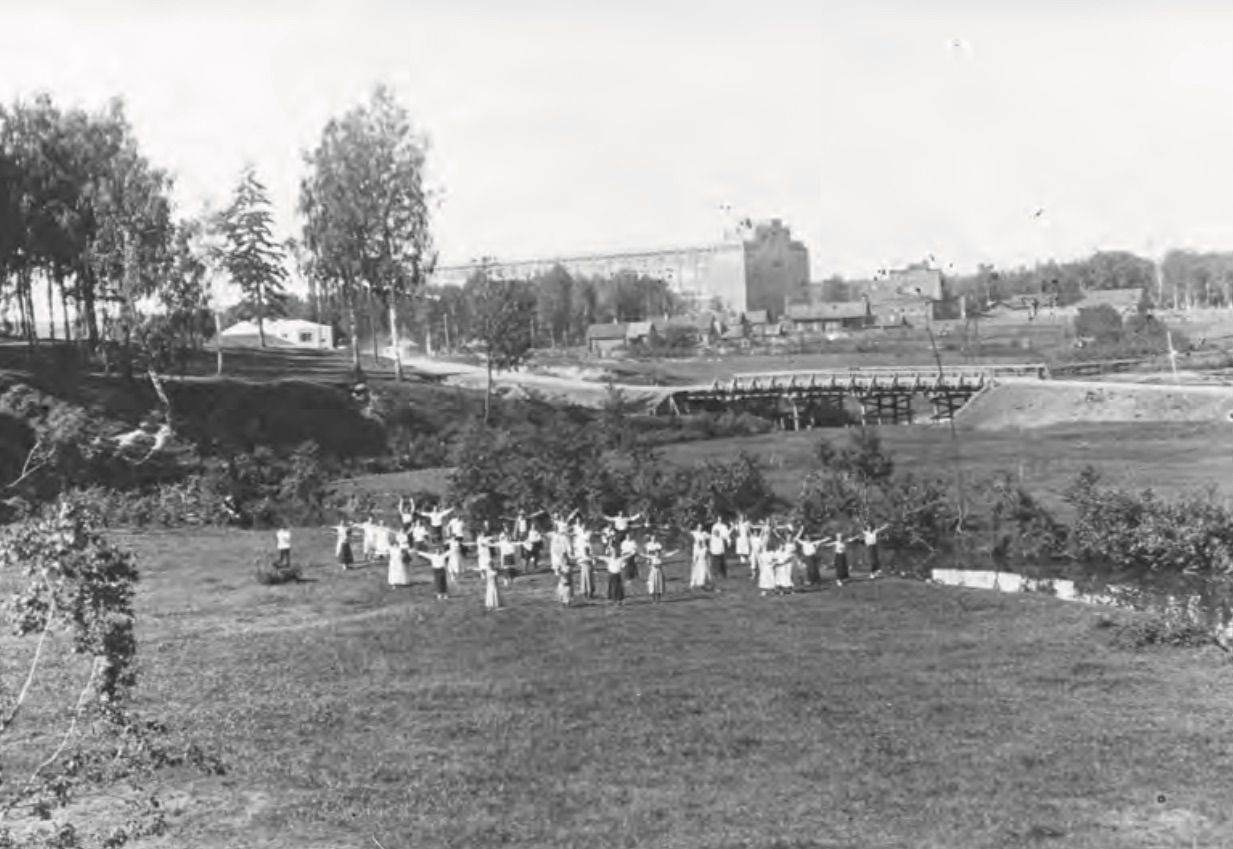 Рядом с ним был парк (бывший Лыжина), очень оживлённый в воскресные дни, когда шли фильмы. Перед показом кино и после него люди садились на многочисленные лавочки по аллеям парка, задушевно беседовали, смеялись. Это были рабочие фабрики № 4 и другие горожане. Центр парка украшала клумба с цветами, лавочки вокруг которой всегда были заполнены людьми. В конце парка (ближе к даче Лыжина) была танцплощадка со сценой-ракушкой, на которой играл духовой оркестр.