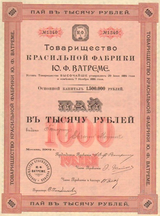 Одно из них – «Товарищество красильной фабрики Ю. Ф. Ватреме», находившейся в Московской губернии и уезде четвёртого стана при селе Ивантеевке, устав которого утверждён 29 июня (11 июля по новому стилю) 1884 года с основным капиталом в 800 тыс. рублей. Учредителями стали: французские граждане Юлий Фёдорович Ватреме (владелец), Клавдий Осипович Жиро и бельгийский подданный Павел Павлович Пети. Помещение товарищества располагалось на Носовском подворье. Пети управлял фабрикой с 1884-го по 1897 год.