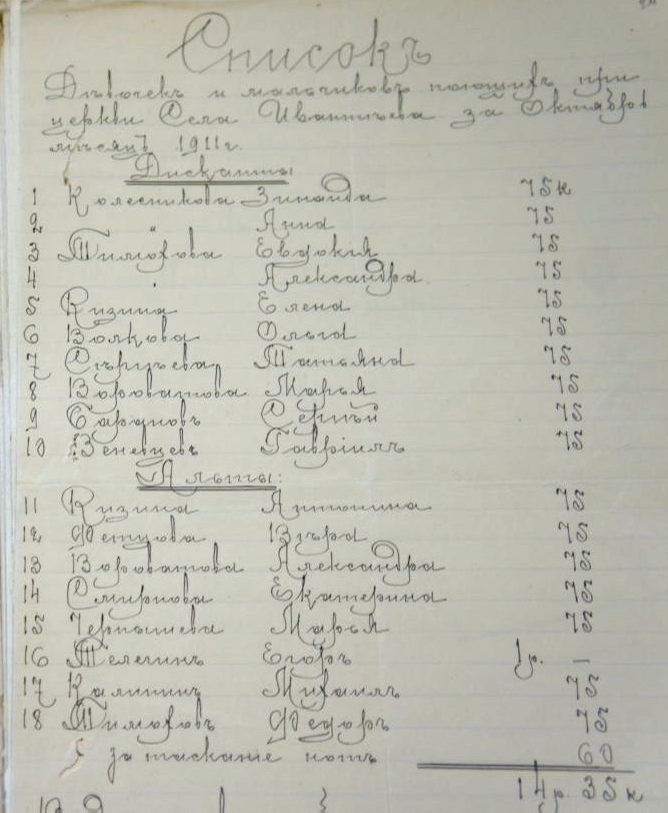 В списке мальчиков-певчих Смоленского храма Ивантеевки июня 1909 года по счету оплаты записано 15 человек из расчёта выплат каждому от 60 копеек до 1 рубля 50 копеек. Трое из ребят носили известную ивантеевскую фамилию Венёвцевы: Иван, Виктор и Василий. За ноты человеку, с не менее известной в Ивантеевке фамилией Горбунов, было выдано 60 копеек. Всего по итогу июня выведена сумма в 16 рублей 15 копеек.