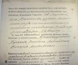 Указ его Императорского величества, самодержца Всероссийского из Московской духовной консистории определённому Церковным старостой в Спасской, села Вантеева, церкви Московского уезда, потомственному почётному гражданину Владимиру Александровичу Лыжину по указу его Императорского величества Московская духовная консистория, во исполнение резолюции Пресвященного Паросния, Епископа Можайского, Викария Московского