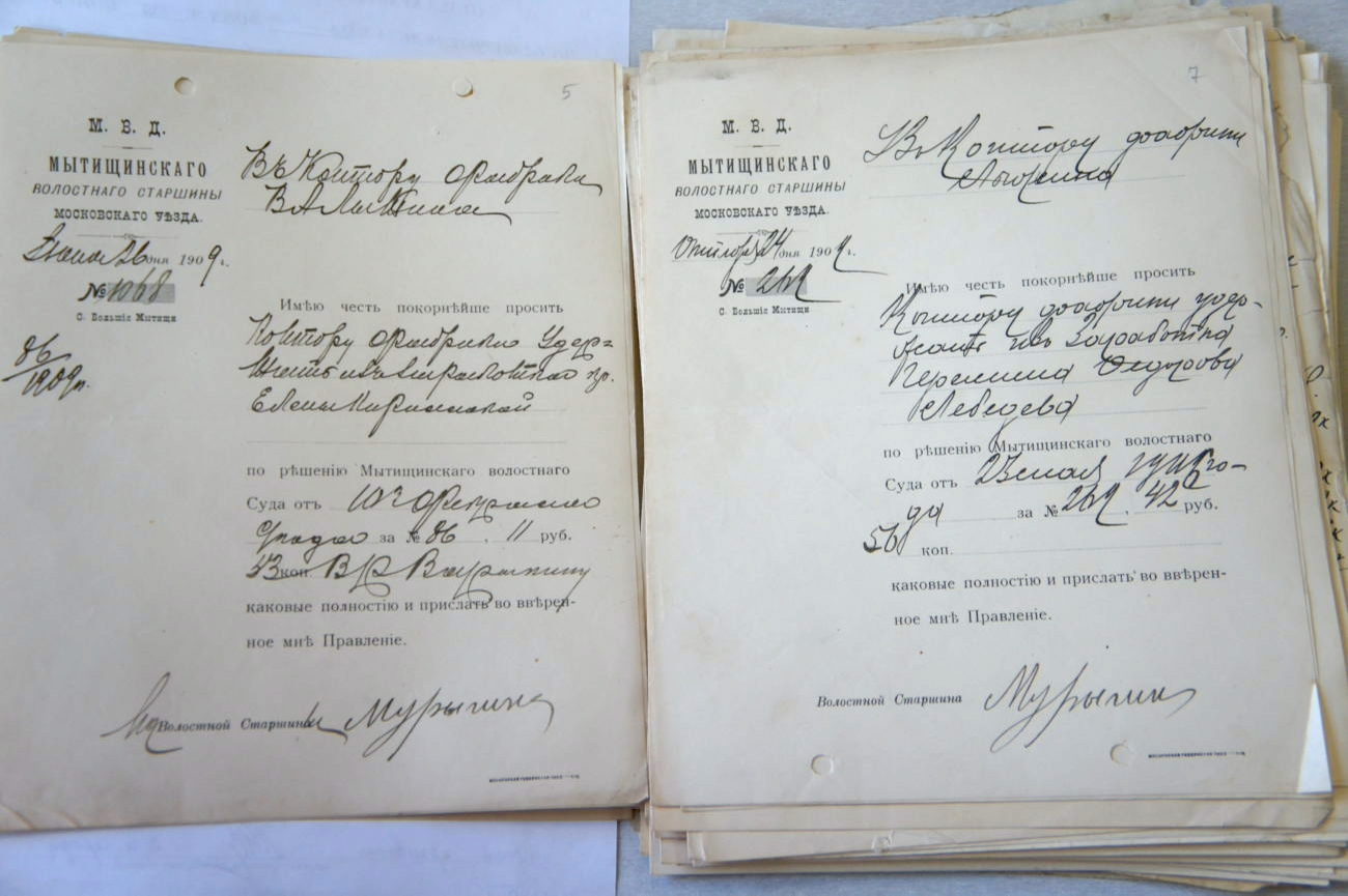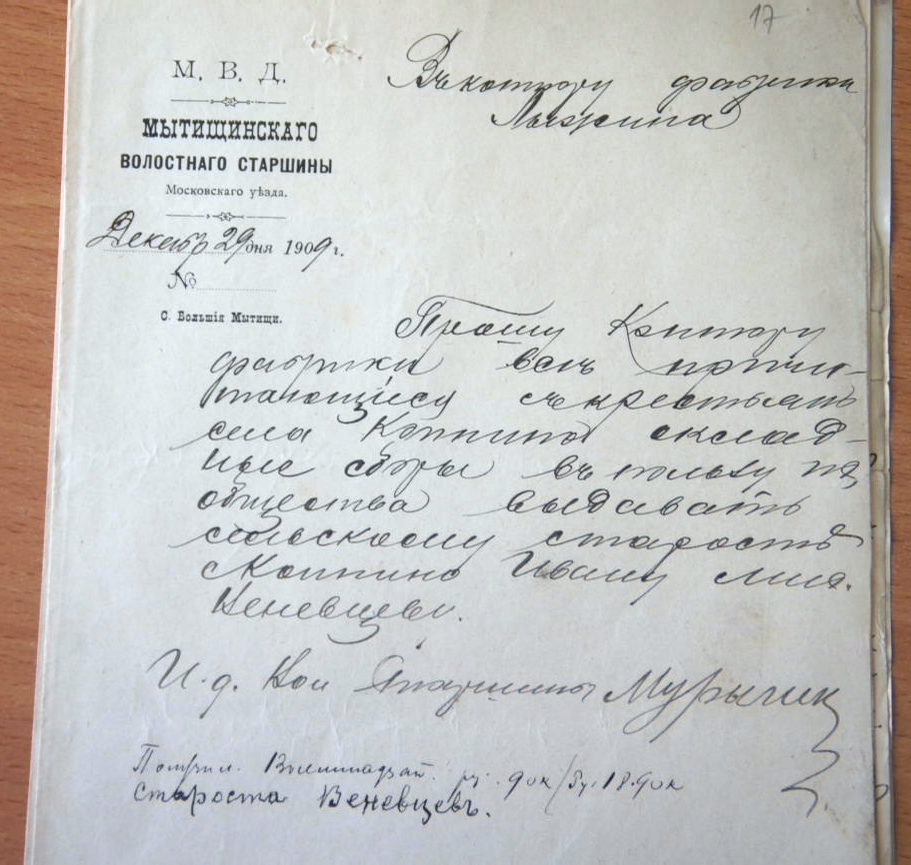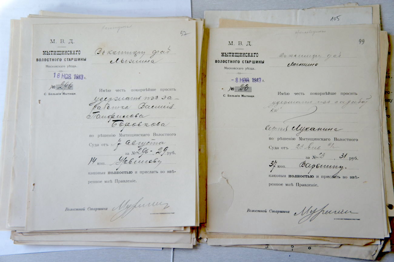 По аббревиатурой М.В.Д., то есть от лица Министерства Внутренних дел России Мытищинское волостное правление отправляло листы об удержании из заработной платы крестьян и служащих ивантеевской фабрики за провинности, в большинстве случаев за долги. Документы в контору Лыжину села Вантеевка и Москвы подписаны Мытищинским волостным старшиной Мурыгиным. Обычно на эту должность выбирали на строк до 3 лет, но наш старшина прослужил в должности как минимум 4 года, и судя по сохранности документов, был аккуратен и ответственен. Но для начала определимся с тем, кем были волостные старшины до 1917 года.