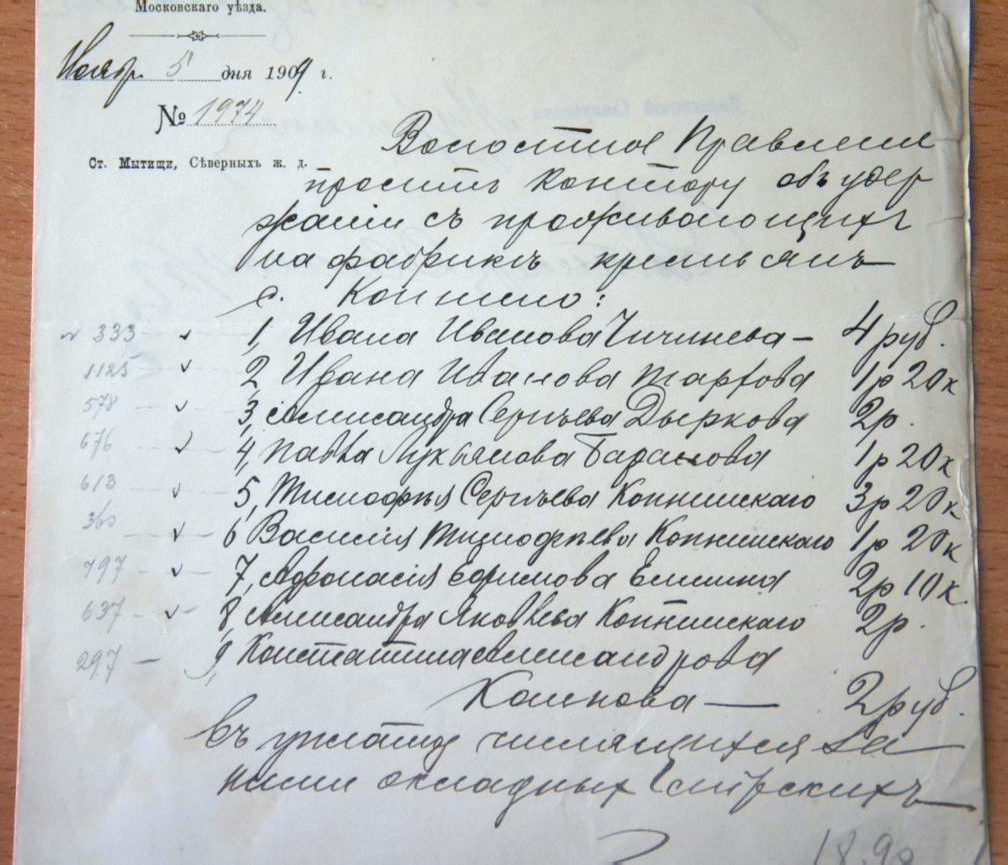 Есть документ 1909 года за подписью старшины Мурыгина об удержании с заработной платы от 1 до 4 рублей с девяти крестьян складных членских взносов.