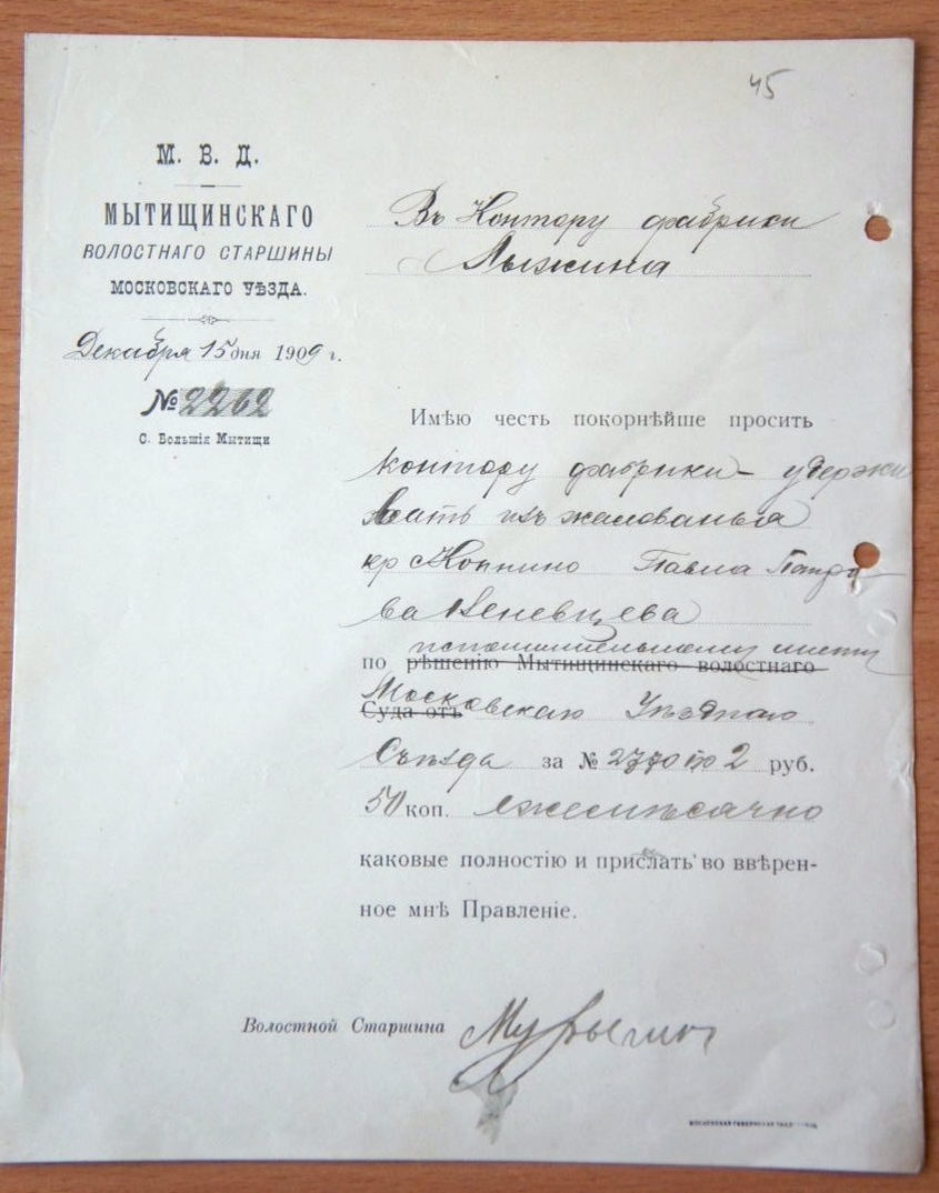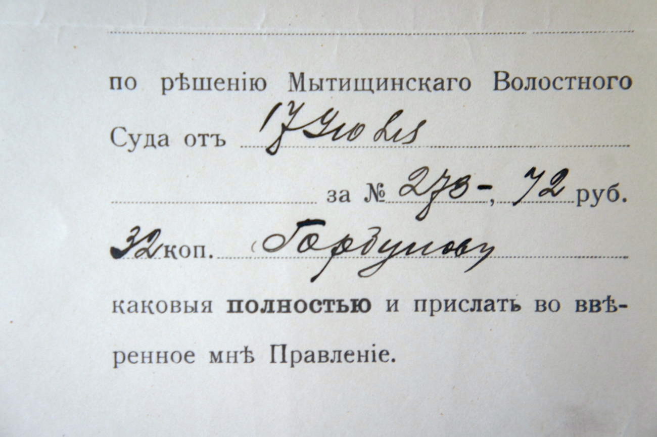 Прошу удержать из заработка Ивана Матвеева Скотникова по решению Мытищинского Волостного Суда от 10 сентября 1913 года № 273, 72 рубля, 32 копейки в пользу Горбунова, каковые полностью и прислать во вверенное мне Правление.