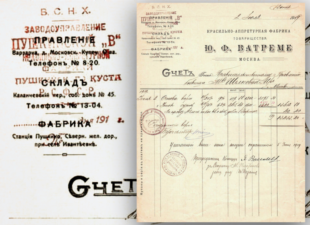 После национализации 1918 года красильную фабрику в Ивантеевке Товарищества Ю. Ф. Ватреме переименовали в Пушкинскую[1] «В» красильно-аппретурную фабрику. Первые годы советской власти она продолжала выпускать продукцию, в том числе красила шерстяную материю для Красной Армии.