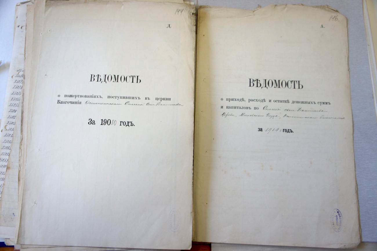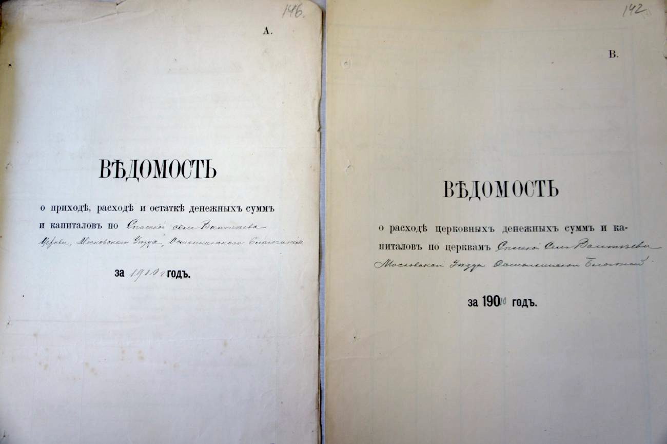 Три Ведомости содержат сведения о приходе, расходе и остатке денежных сумм и капиталов, еще в одном документе говорится о пожертвованиях на церковь. Они пронумерованы буквами А, В, Г, Д, несмотря на то, что на одной из них, видимо в спешке, вручную не проставлена дата, логично сделать вывод о сохранившейся для истории летописи годичной жизни ивантеевского храма.