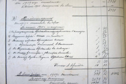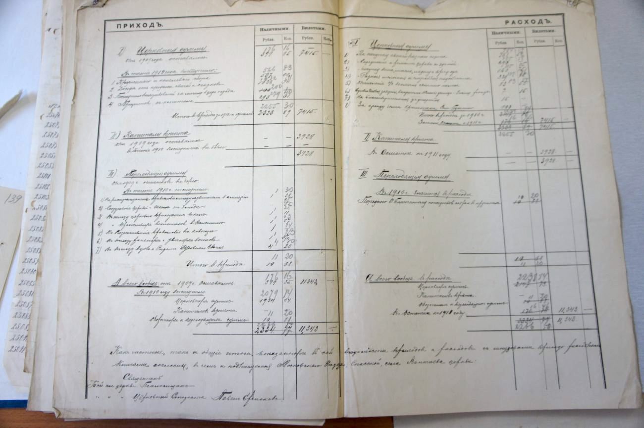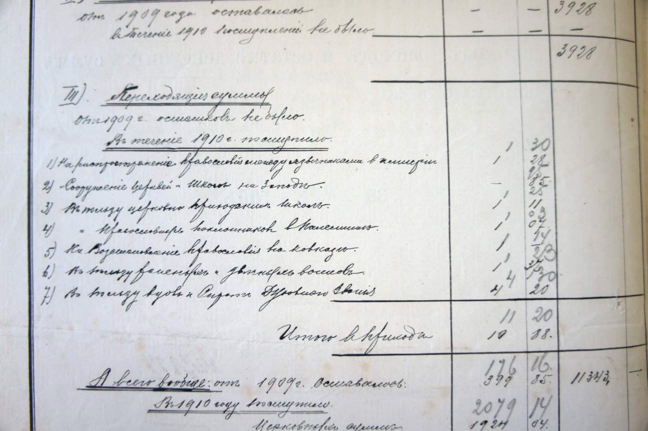 В первом и последнем пункте содержаться сведения об остатках сумм доходов с 1909-го и расходов к 1911 году. Во втором перечисляется доходы, среди которых самый большой от продажи свечей и огарков, затем по убывающей — сбор денег кружечный и кошельковый, проценты от капитала и пожертвования за могилу в церковной ограде.