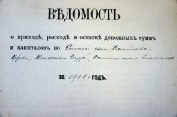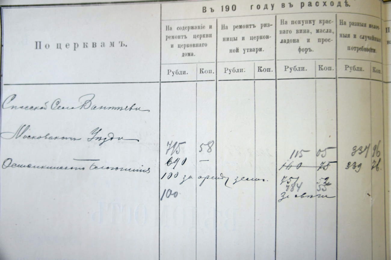 Следующим пунктами обозначены поступления на сооружения церквей, в пользу приходских школ, на пользу вдов и сирот духовного звания и так далее. Церковные средства расходовались: на покупку церковных свечей различного сорта, содержание и ремонт церкви и зданий, покупку масла и ладана, служебные надобности, на аренду земли крестьянам села Пушкино, на благотворительные учреждения, на духовные учебные заведения — в их числе училища для женщин и звонарей.