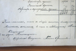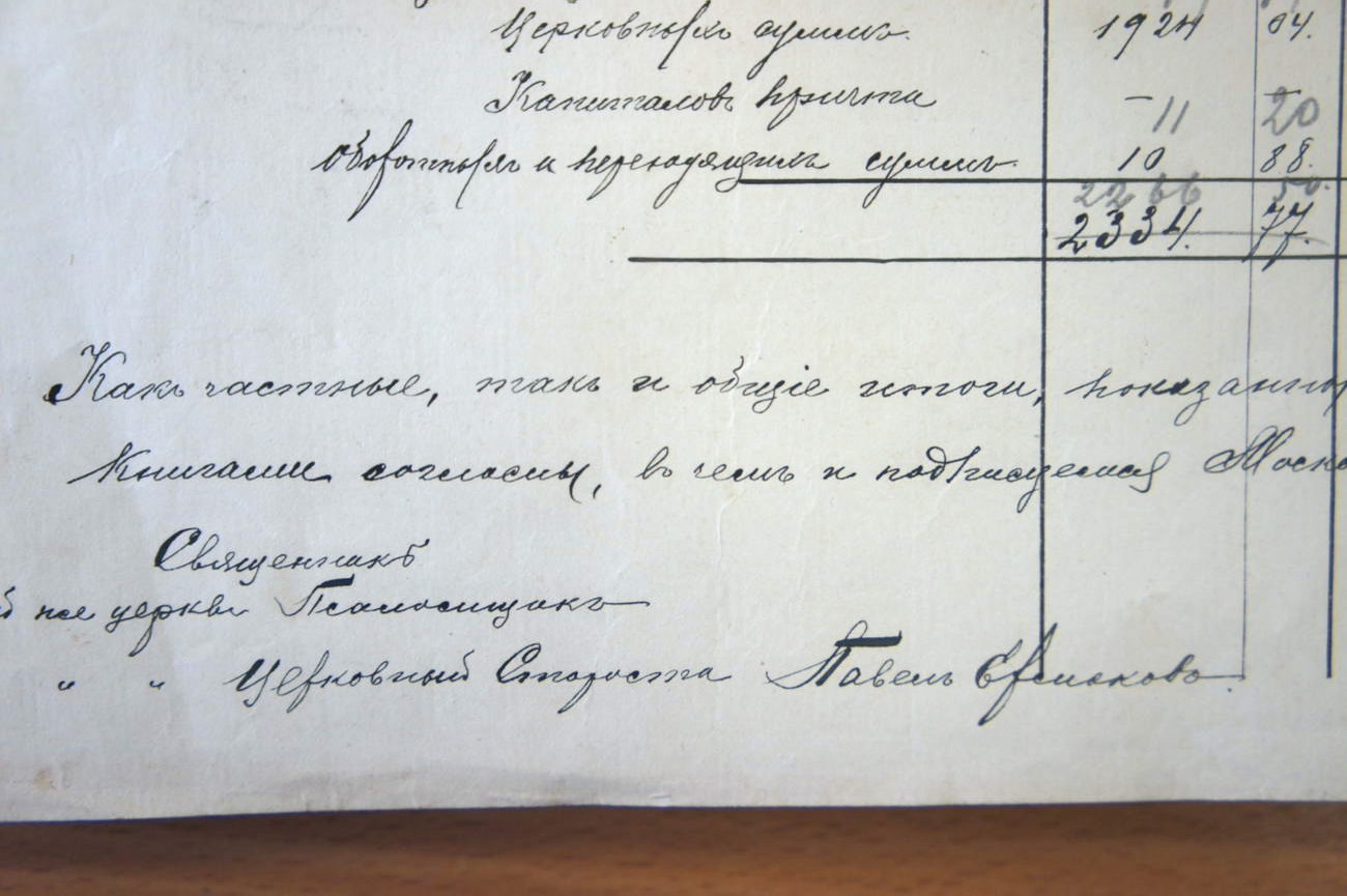 Подпись церковного старосты гласит: «Как частные, так и общие итоги показывающие в сей Ведомости приходов, расходов и доходов Книгами согласны, в чем и подписываемся. Священник той же Церкви, Псаломщик и Церковный староста Павел Ермаков».[1]