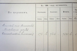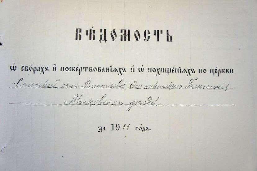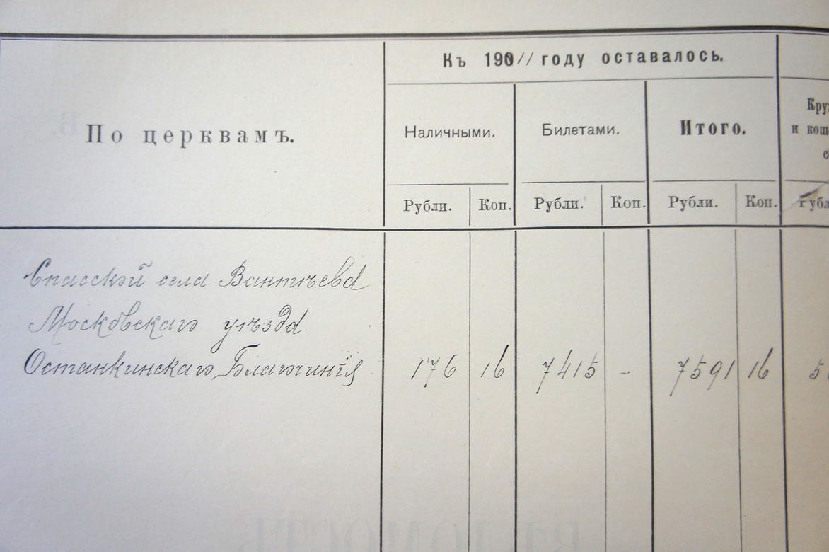 В ведомостях группы «А» о приходе, расходе и остатке денежных сумм и капиталов по Спасской, села Вантеева церкви, Московского Уезда, Останкинского Благочиния поступали доходы церковных сумм:
