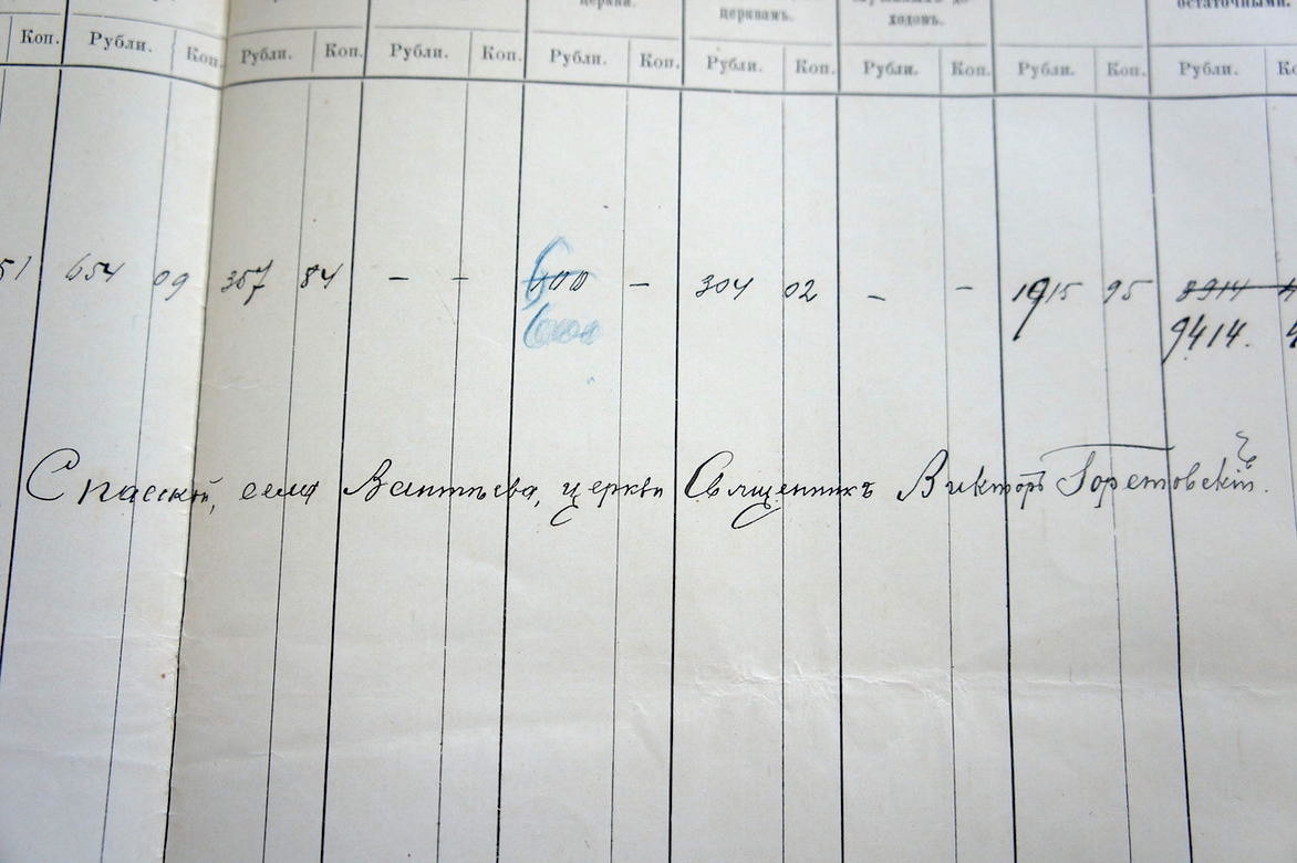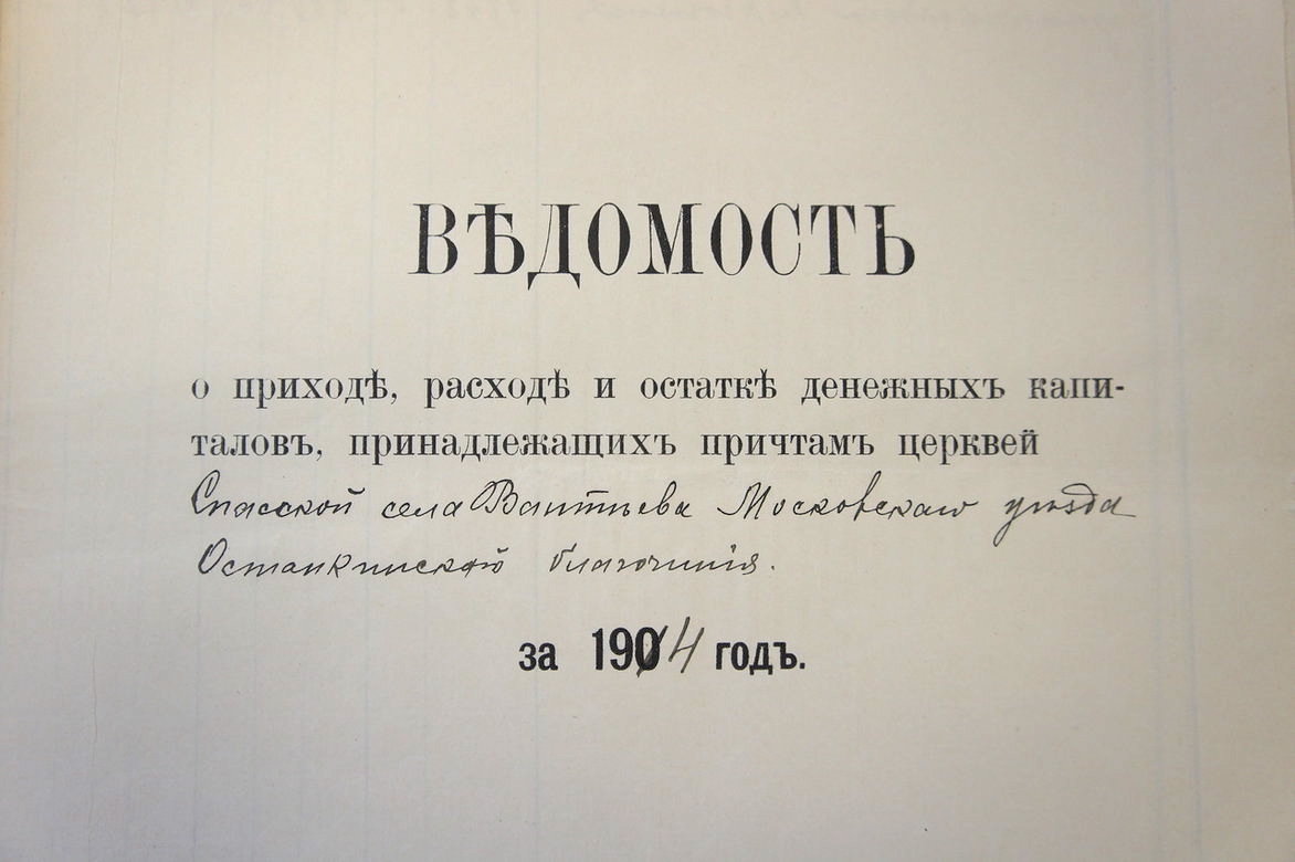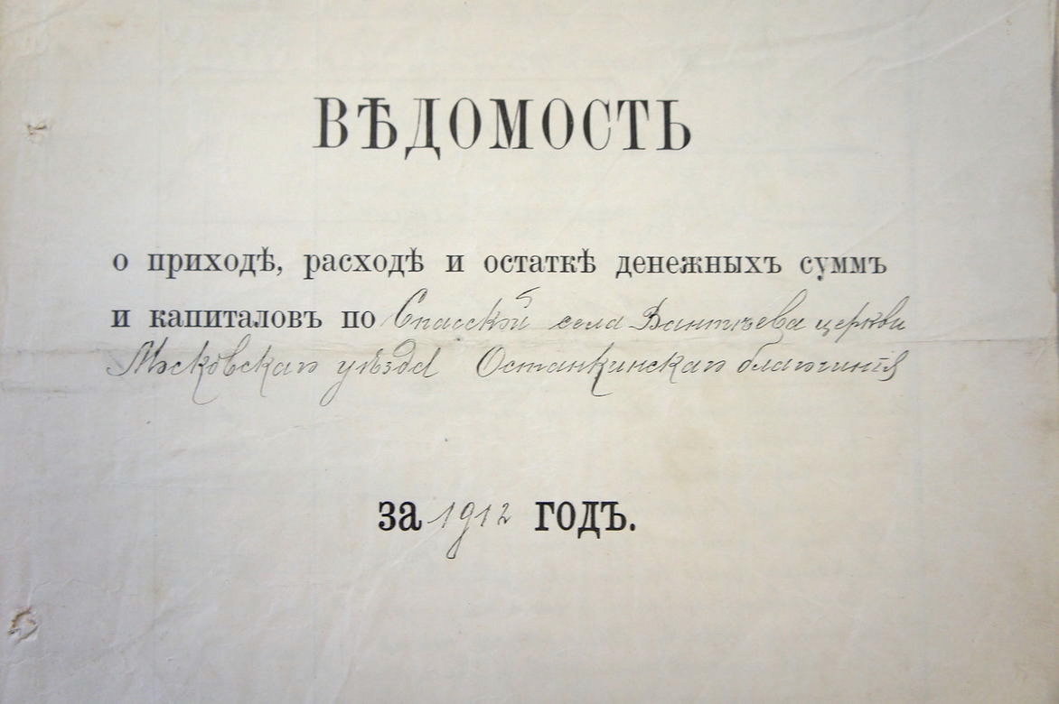Ведомости доходов, расходов и пожертвований для Спасской, ныне Смоленской церкви, в наиболее полном виде сохранились в архиве ЦГА за период с 1911 по 1914 год. Документы делятся на пять групп. В конце каждого года подводились итоги на страницах в двух колонках, доходы церковной ведомости в общей сумме совпадали с расходами. Из года в год практически в неизменном виде передавались средства по «билетам». Так именовалась часть средств, хранившаяся в ценных бумагах как запас неприкосновенный. Ведомости 1914 года о доходах и расходах причта[1] подписаны священником Виктором Горетовским[2].